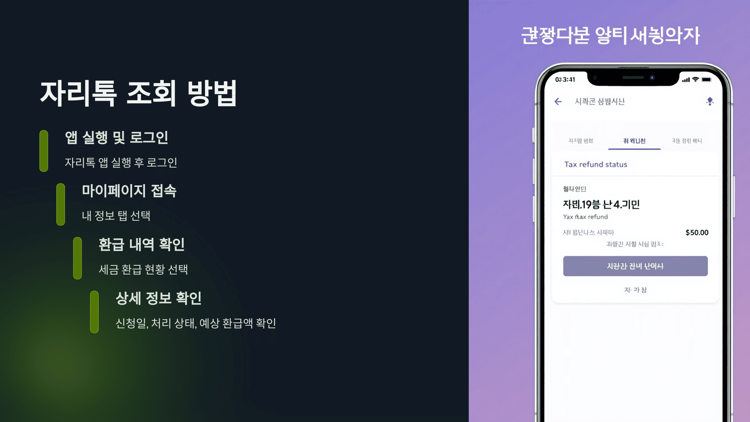 국세청 홈택스 모바일 앱이나 자리톡 앱을 활용하면 언제든지 간편하게 환급 상태를 확인할 수 있습니다.