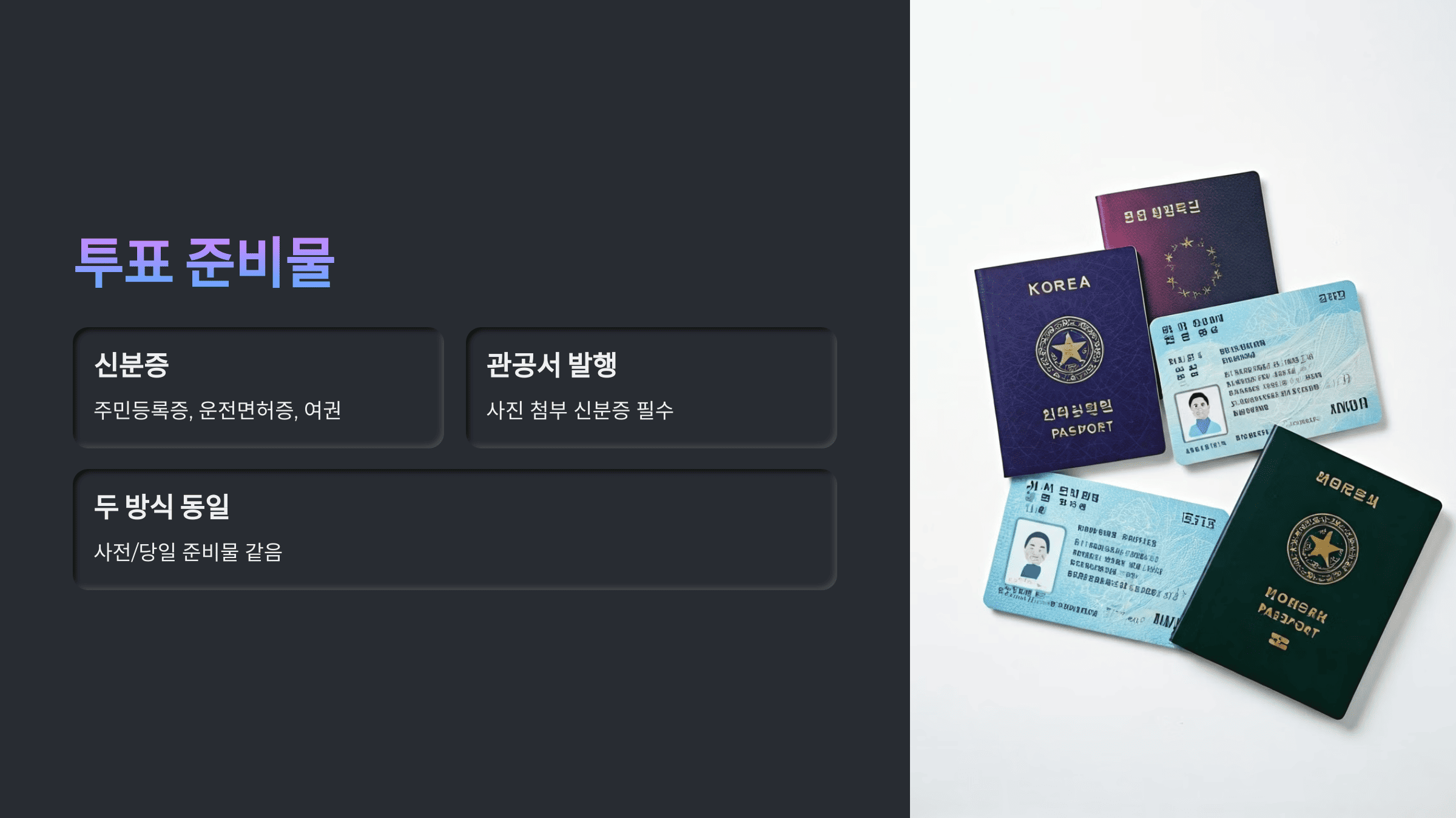 사전투표는 전국 어디서나 가능하지만, 당일투표는 주민등록지 기준이라는 점에서 차이가 있죠.
